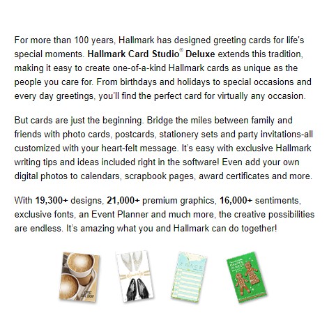 From birthdays and holidays to special occasions and every day greetings. For more than 100 years, hallmark has designed greeting cards for life's special moments. This greeting card software free comprises over 18,000 cards and projects for all sorts of occasions, over 20,000 clip art pictures along with a gallery of 15,000 hallmark variations with the proper choice of words for every card. But cards are just the beginning. Solution home hallmark card studio.